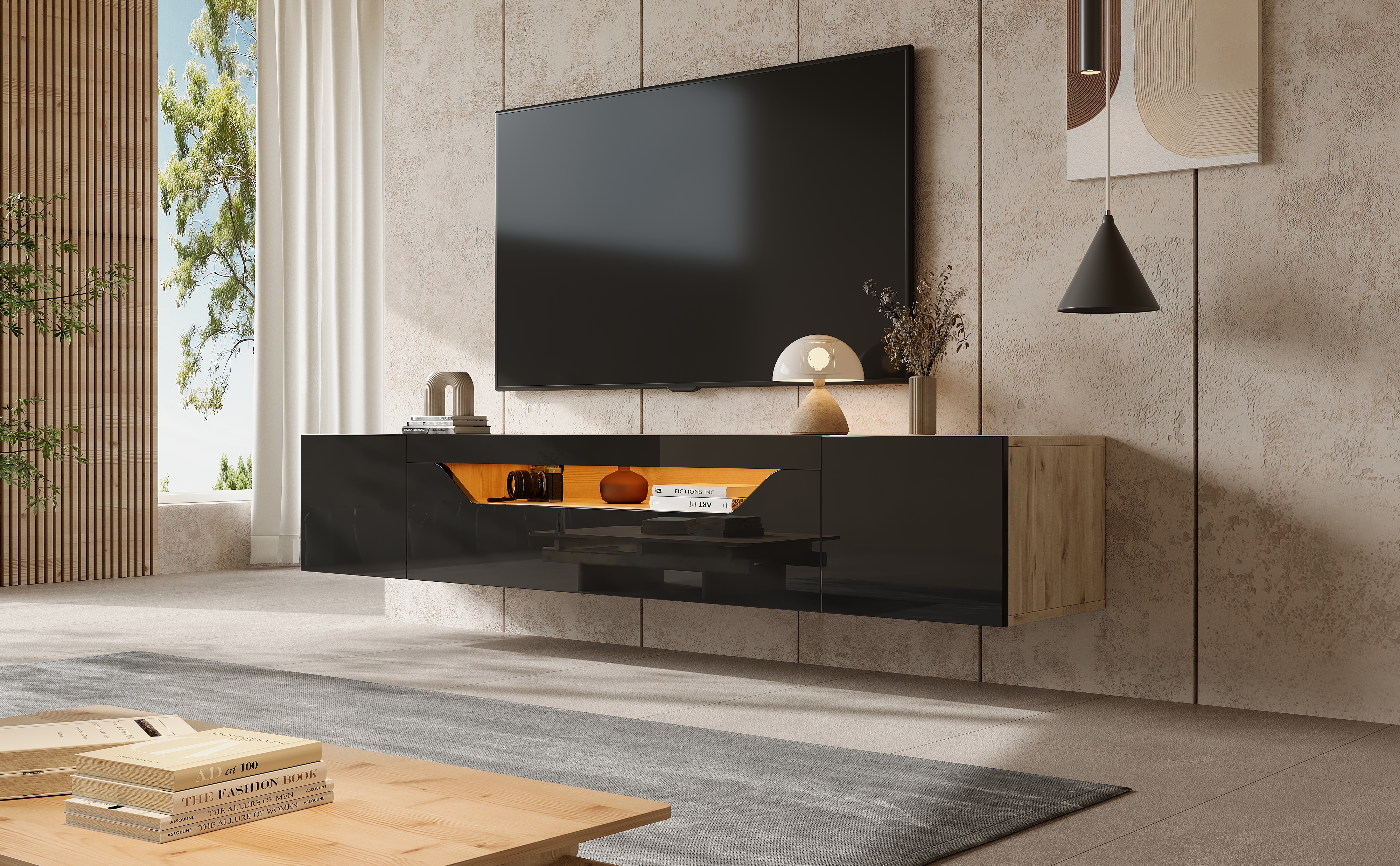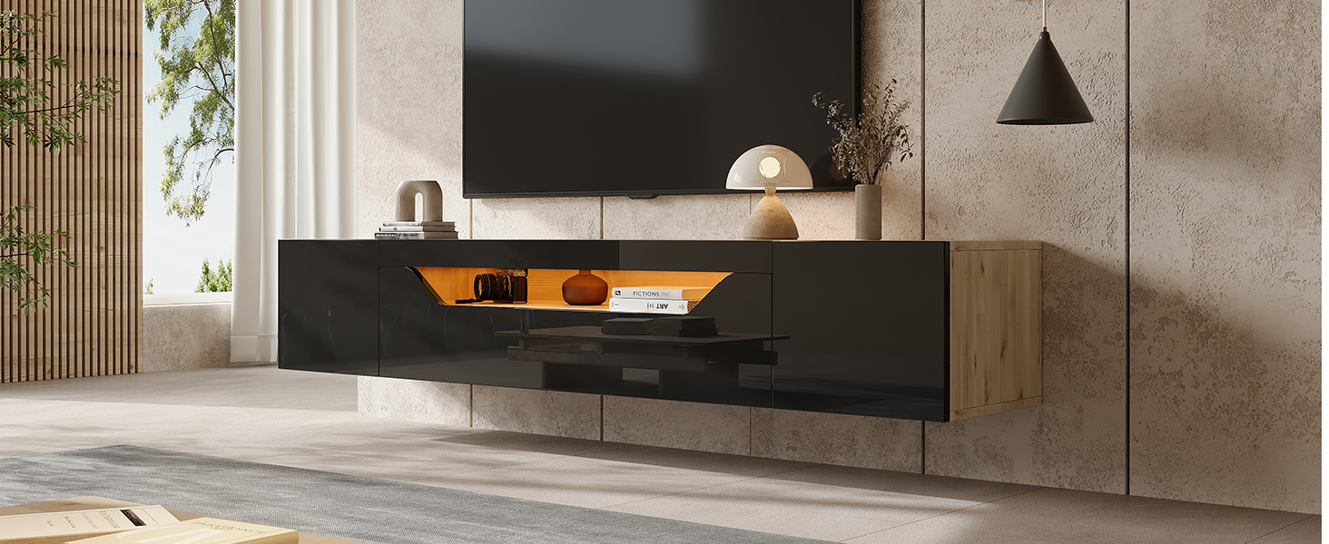 - . High-gloss design: The high-gloss panel and contrasting color scheme make it a stylish choice for a minimalist living room. The warmth of the natural wood grain softens the coolness of the black. When the LED lights are on, they are understated and subtle during the day, while emitting a warm glow at night, presenting different styles depending on the surrounding environment. (High-gloss area only, front view)