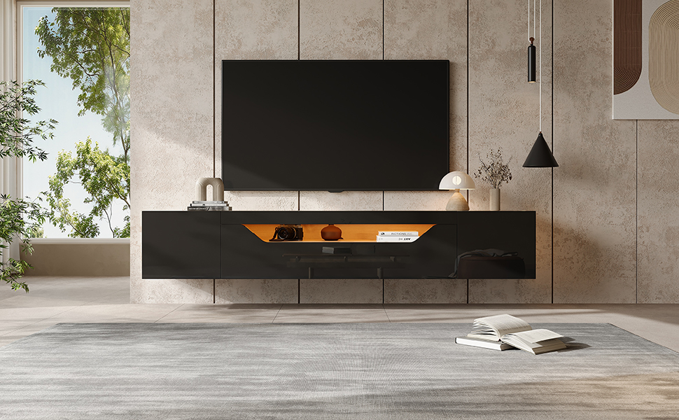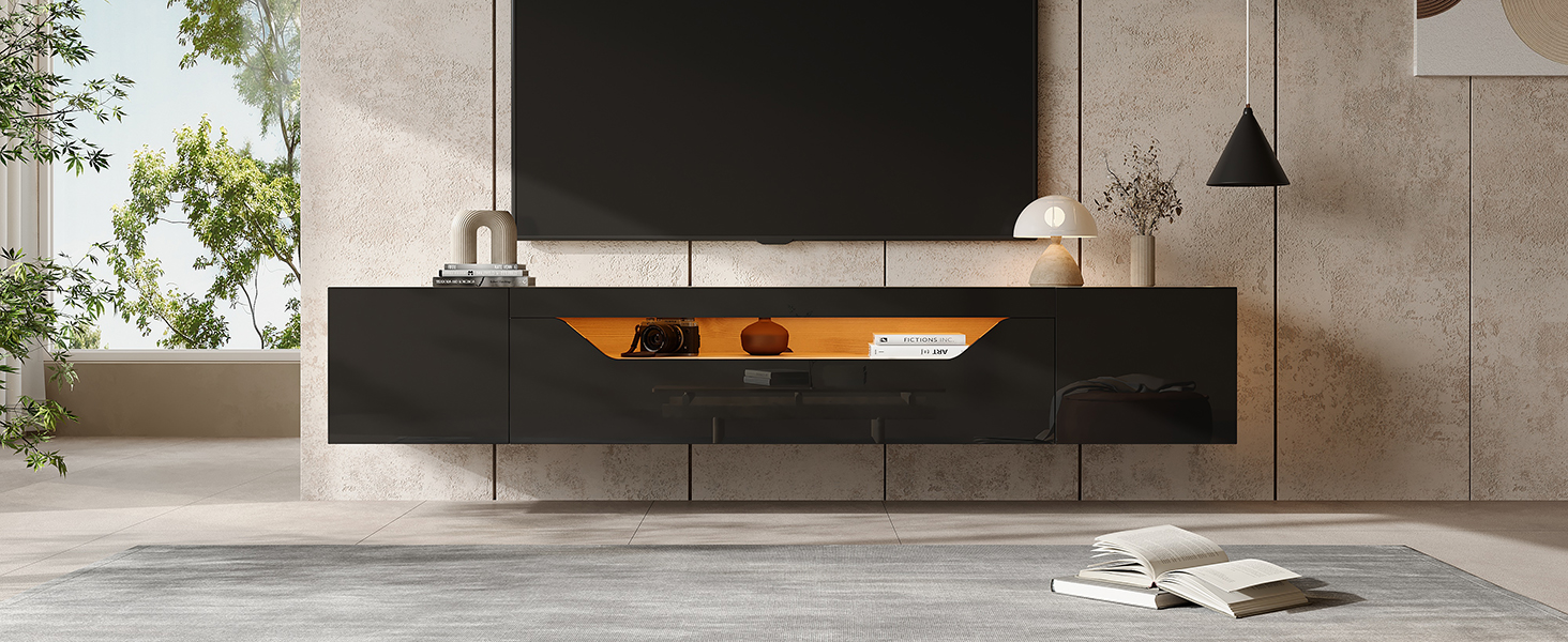 Product Name:Floating TV Stand Cabinet with LED lights, High Gloss TV Unit with Pull-Down Door, Wall Mounted TV Entertainment Center with 2doors, for Living room Bedroom, 180*37*36cm, Black, Holds TVs up to 75"