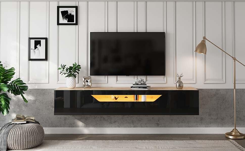 - Wall-mounted design: The wall-mounted design saves space! Measuring 180 x 37 x 36 cm, it's suitable for a 75-inch TV, featuring a striking contrast between natural wood grain veneer and a high-gloss black panel. You can easily and stylishly mount it on your living room wall.