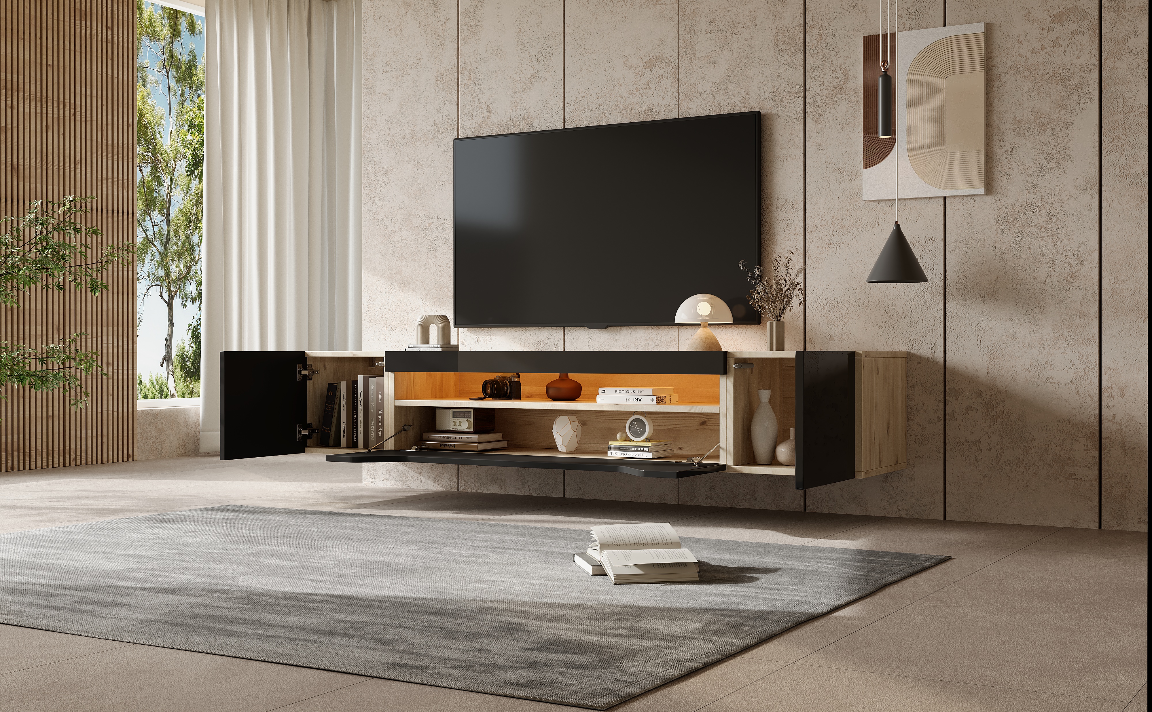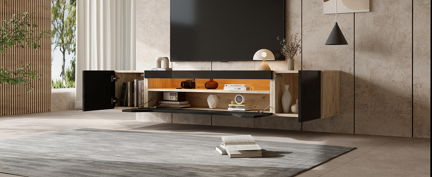 This wall-mounted TV cabinet measures 180 x 37 x 36 cm and is suitable for a 75-inch TV. Its open design saves space and is easy to clean. It features cabinet doors on both sides and a large storage space with shelves in the middle. Multiple storage compartments allow for easy organization of various items, and the bottom pull-down cabinet doors open and close smoothly. The high-gloss panel contrasts beautifully with the natural wood grain and black finish. LED lights controllable via a smartphone app allow you to create various atmospheres. The robust and durable particleboard structure can support a total weight of 60 kg, ensuring long-term safe storage. Please note that the product is shipped in two packages; self-assembly is required after receiving all parts.